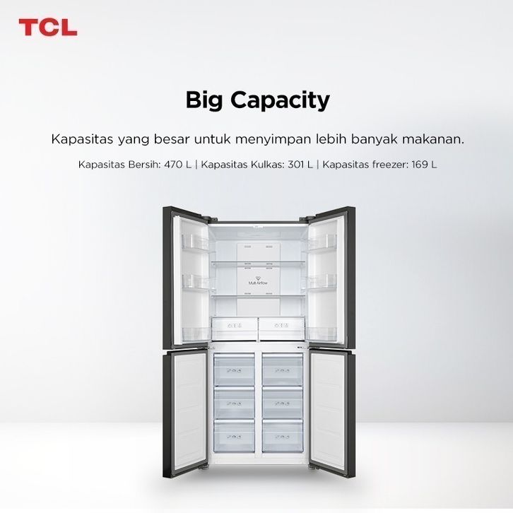 TCL Kulkas 4 Pintu - Kapasitas 460L - Bio Fresh - Wet and Dry Storage - Tanpa Bunga Es - Lemari Es - P580CD