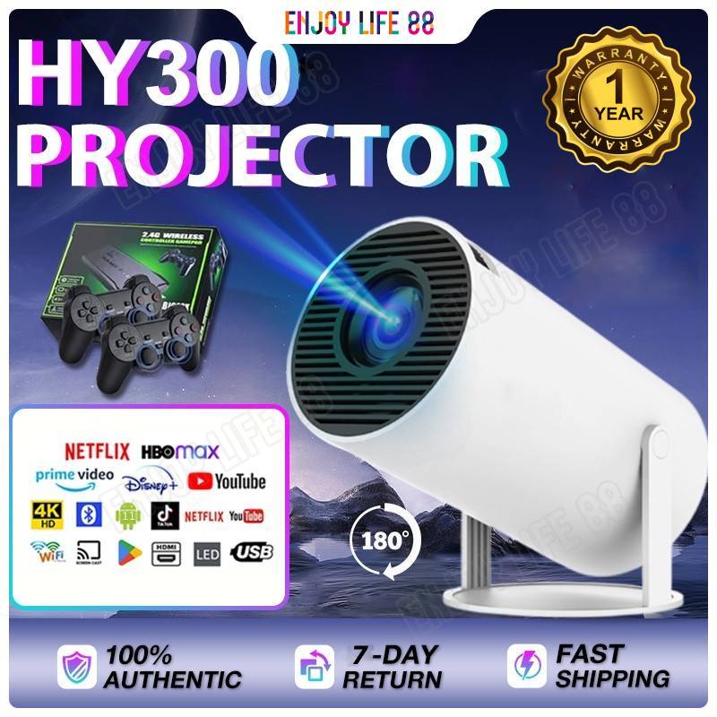 GARANSI 1 TAHUNPROYEKTOR HY300 SMART PROJECTOR ANDROID 11.0 1GB+8GB HOME BEAMER 4K HD WIFI6.0 BLUETOOTH MINI PORTABLE PROYEKTOR FOR HOME THEATER VIDEO PROYECTOR