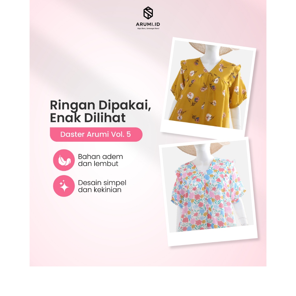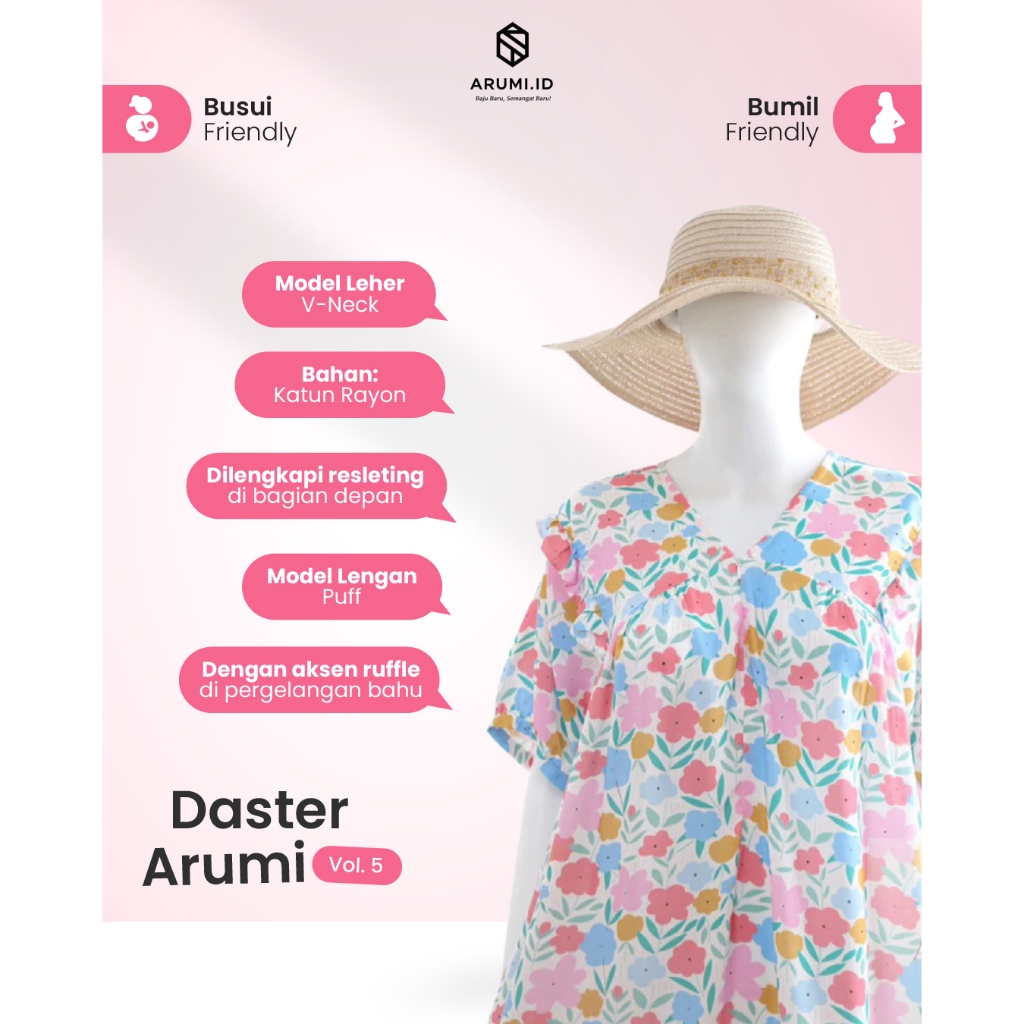 Daster Muslimah Arumi Rayon V-Neck Lengan Puff Ruffle Lembut Adem Resleting Depan Busui Friendly Ringan Harian Vol 5