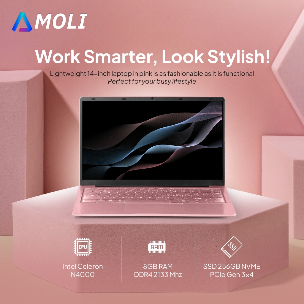 AMOLI Laptop Pink / Hitam/ Silver RAM 8GB + SSD 256GB 14 inch Intel N4000 Instalasi Windows 11 + Office Laptop Tipis Dan