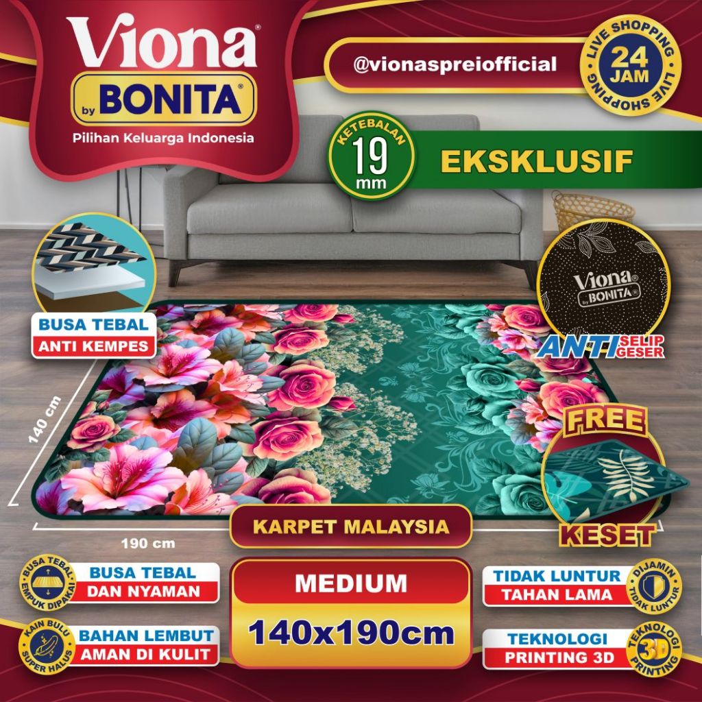 {FREE KESET} VIONA BONITA 140x190 Karpet Busa Malaysia 16mm Luminor Motif Bunga - Karpet Lembut & Anti Licin