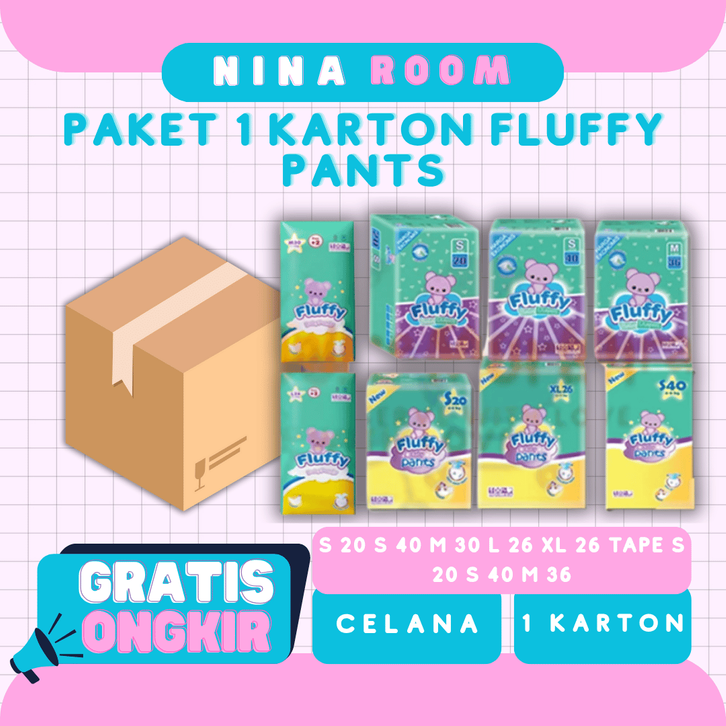 POPOK BAYI FLUFFY PANTS CELANA PAKET HEMAT 1 KARTON BERGAI UKURAN S 20 S 40 M 30 L 26 XL 26 TAPE S 20 S 40 M 36 MURAH
