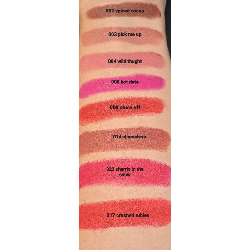 Cherries In The Snow, Audacious Mauve, Pick Me Up, Fiery Sunset, Seductive Sienna, In The Red, Mauve It Over, Shameless, Paradise Pink, Retro Red