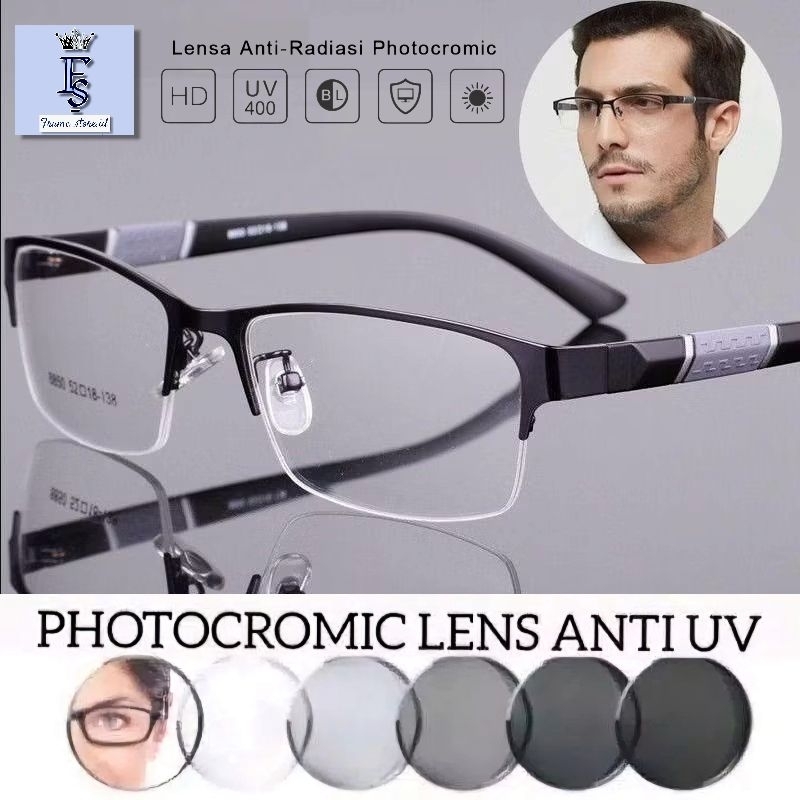 Kacamata Photocromic Lensa Anti Radiasi Standar Optik Frame Gantung / Kaca mata Minus Plus Progresif Bluecromic Unisex (GRATIS BOX DAN LAP)
