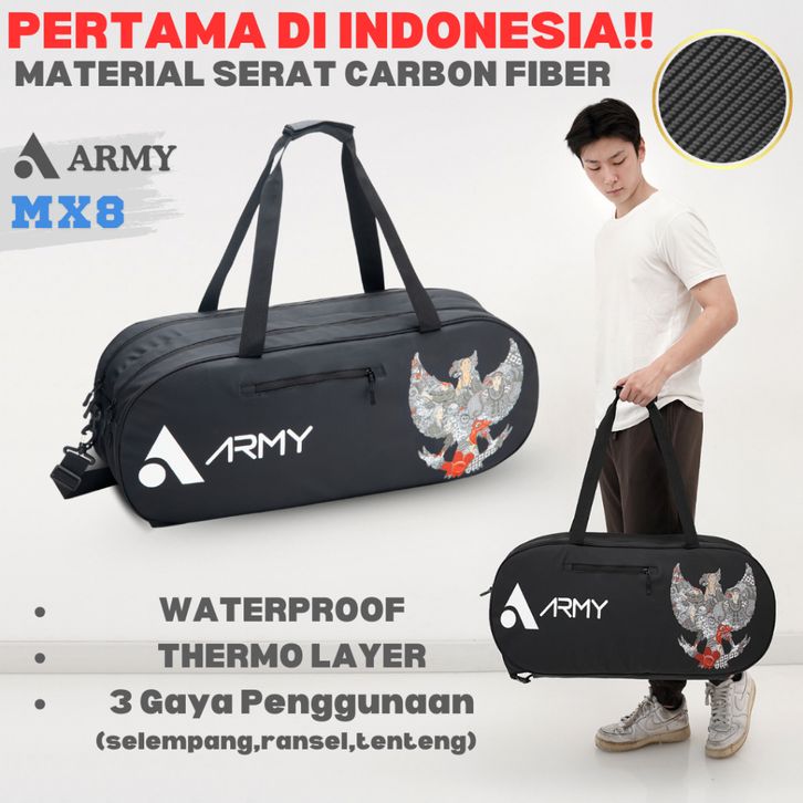 TERLARIS ARMY MX8 TAS CARBON FIBER RANSEL BACKPACK SELEMPANG TENTENG TOTE BADMINTON TENIS PADEL TENNIS