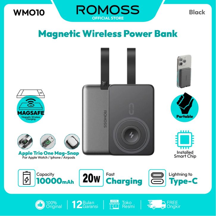 Romoss Powerbank WM010 Type C Fast Charging Lightening Cable Universal Charger 10000 mAh - Black