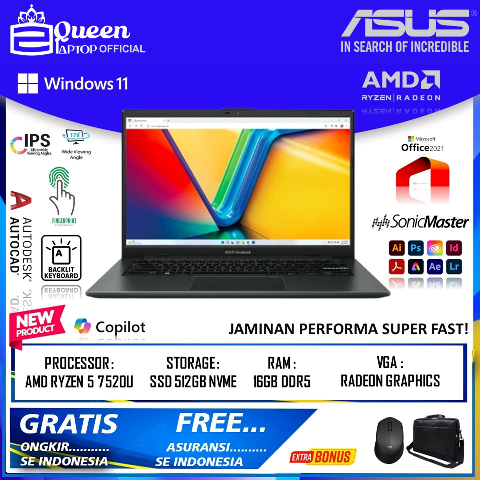 Laptop Asus Vivobook GO 14 AMD RYZEN 5 7520U 16GB DDR5 512GB SSD FHD IPS BACKLIGHT WIN 11 HOME