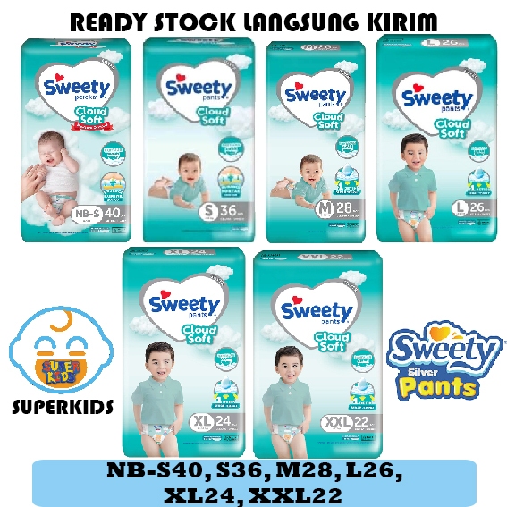 SWEETY NB - ISI 40 TAPE <PEREKAT>, SWEETY S - ISI 38 PANTS <CELANA>, SWEETY M - ISI 32 PANTS <CELANA>, SWEETY L - ISI 28 PANTS <CELANA>, SWEETY XL - ISI 24 PANTS <CELANA>, SWEETY XXL - ISI 22 PANTS <CELANA>, SWEETY NB - ISI 20 TAPE <PEREKAT>