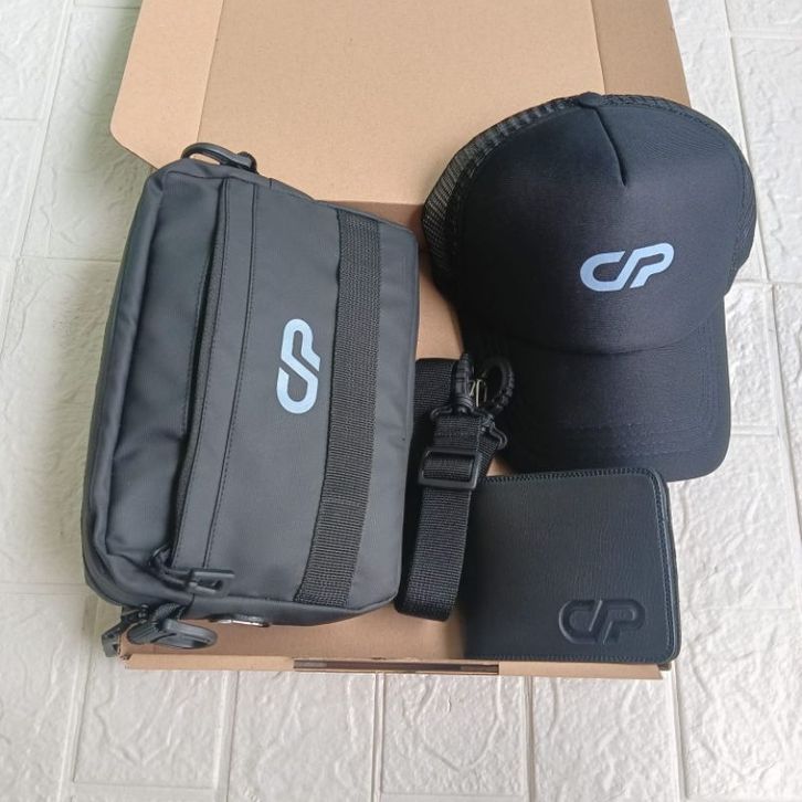 TERMURAH PAKET HAMPERS Kado Give Box CLASSIC PROJECT Tas selempang handbag anti air + Topi Trucker + Dompet Best