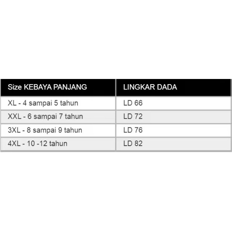 XL 4-5 tahun, XXL 6-7 tahun, XXXL 8-9 tahun, 4L 10-11 tahun, 5L 12-14 tahun