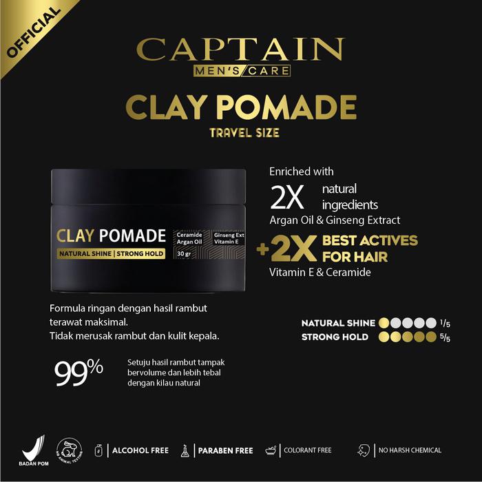 Captain Men'S Care Clay Pomade 30Gr / Pomade Pria / Strong Hold / Natural Shine / Volumizing / Membuat Rambut Tampak Leb