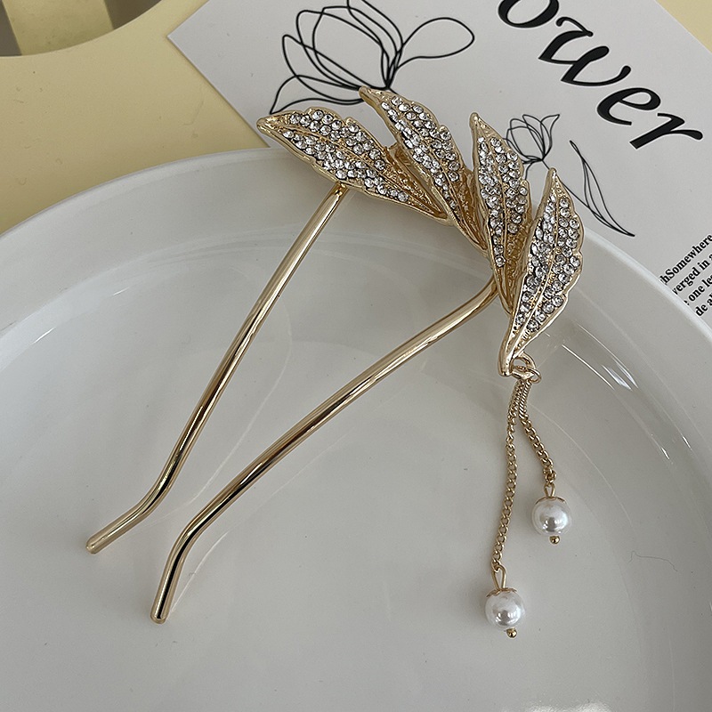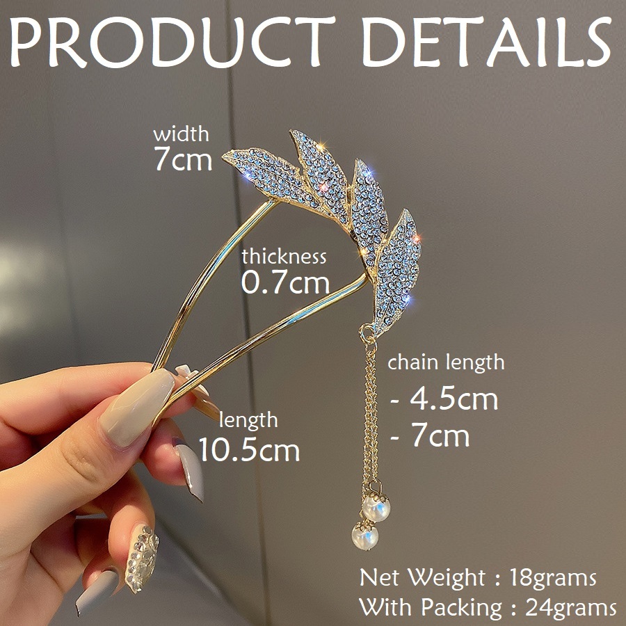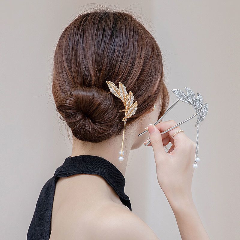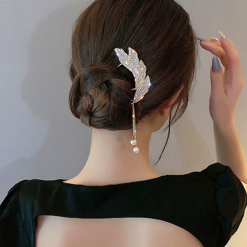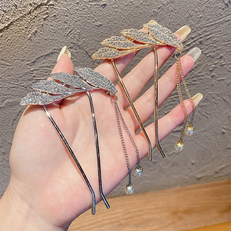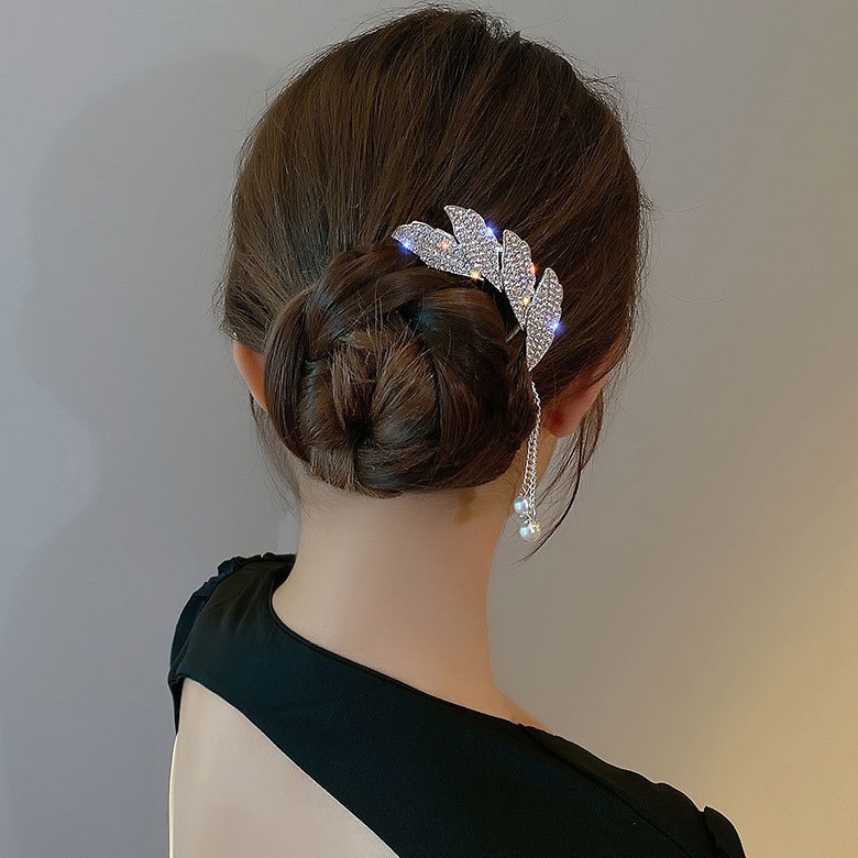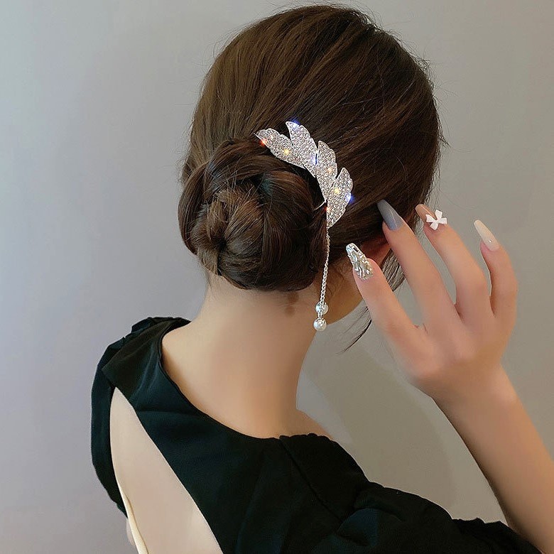 Jepit Rambut Korea Bahan Alloy 10.5cm Aksen Permata dengan Rumbai Tusuk Konde Logam Sirkam Sanggul Pesta untuk Pernikaha