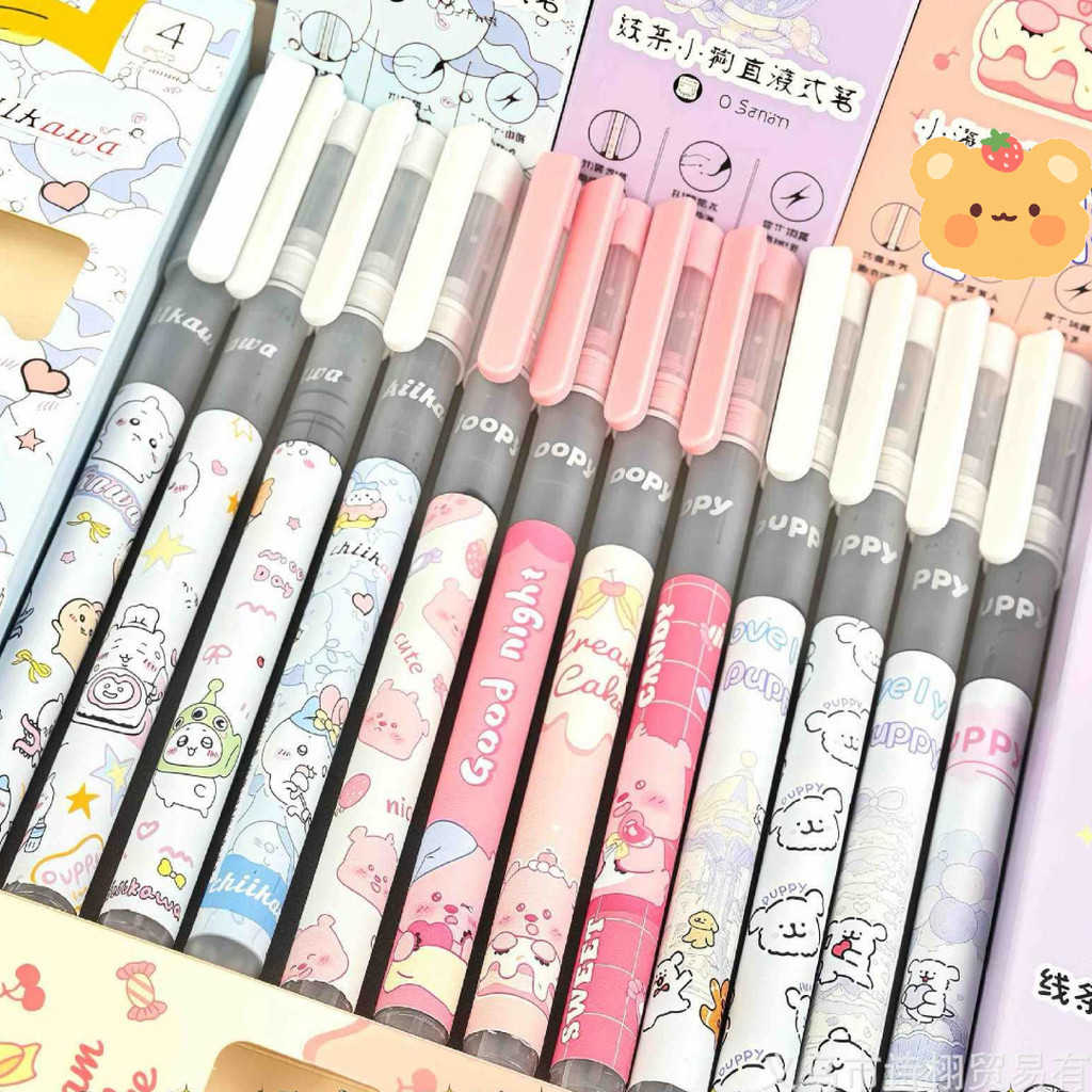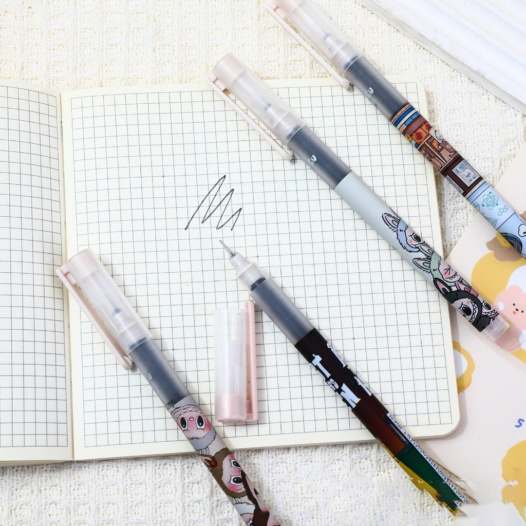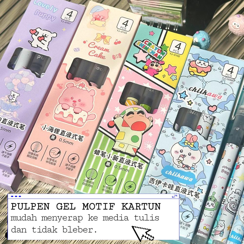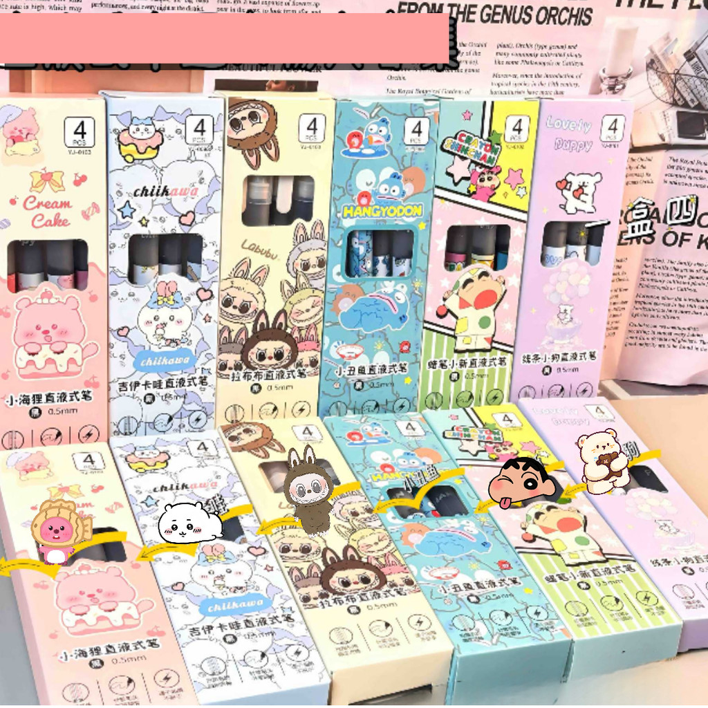 TERMURAH PULPEN 1 SET 4 PCS TIP 0,5 MM MOTIF LABUBU, SHINCHAN, CHIIKAWA DLL TINTA HITAM MUDAH DIATUR
