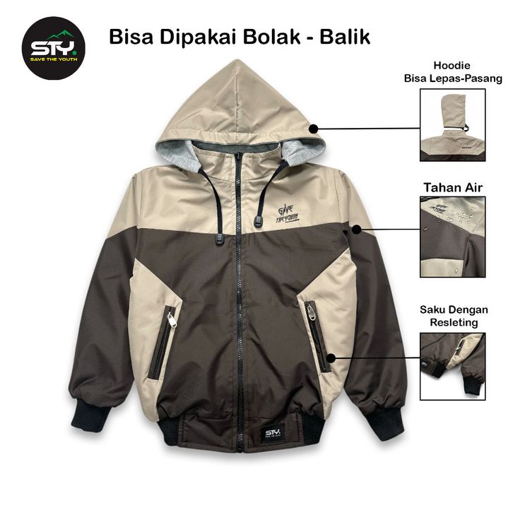 Jaket Parasut Anak Laki laki Tahan Angin dan Tahan Air Bisa Dipakai Bolak Balik Cream