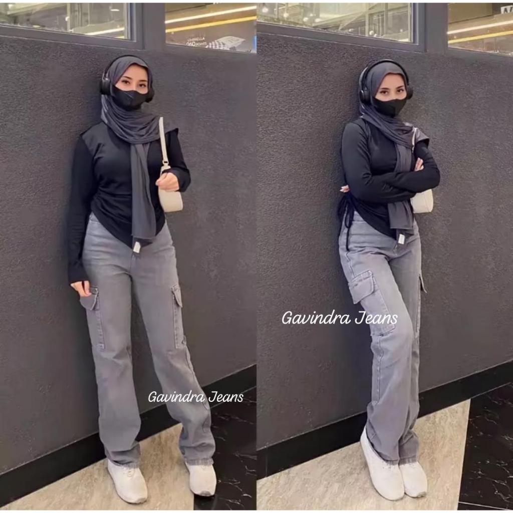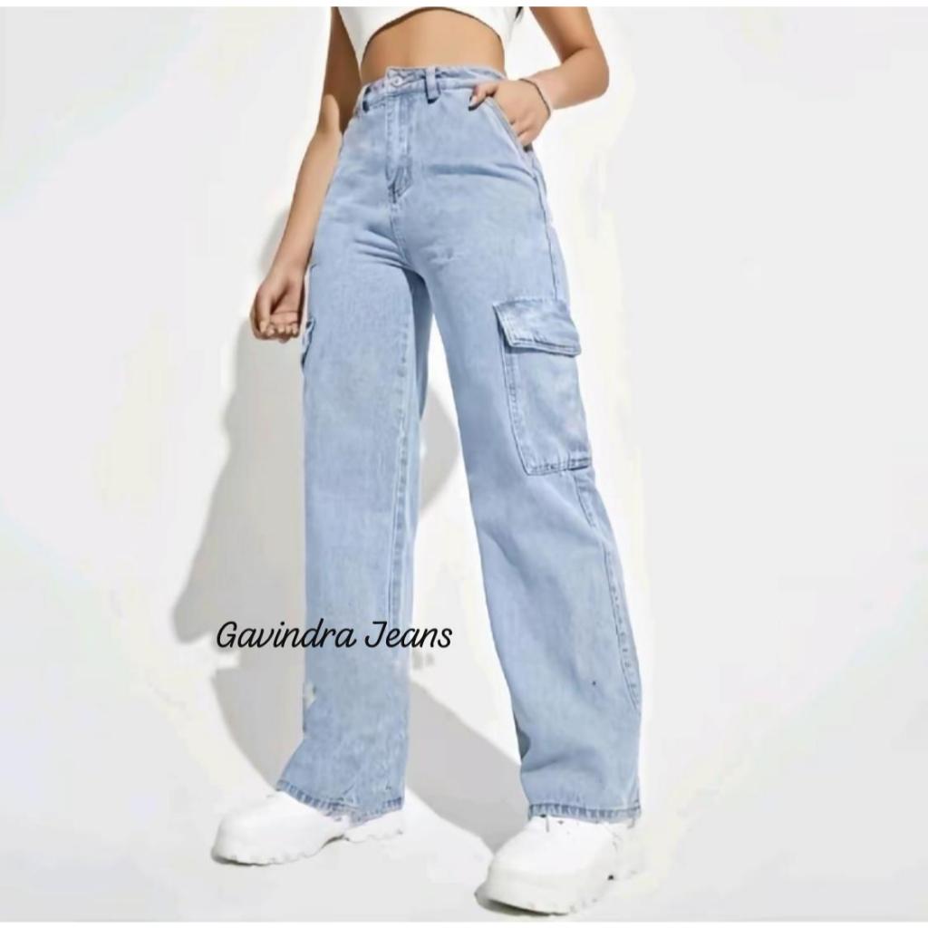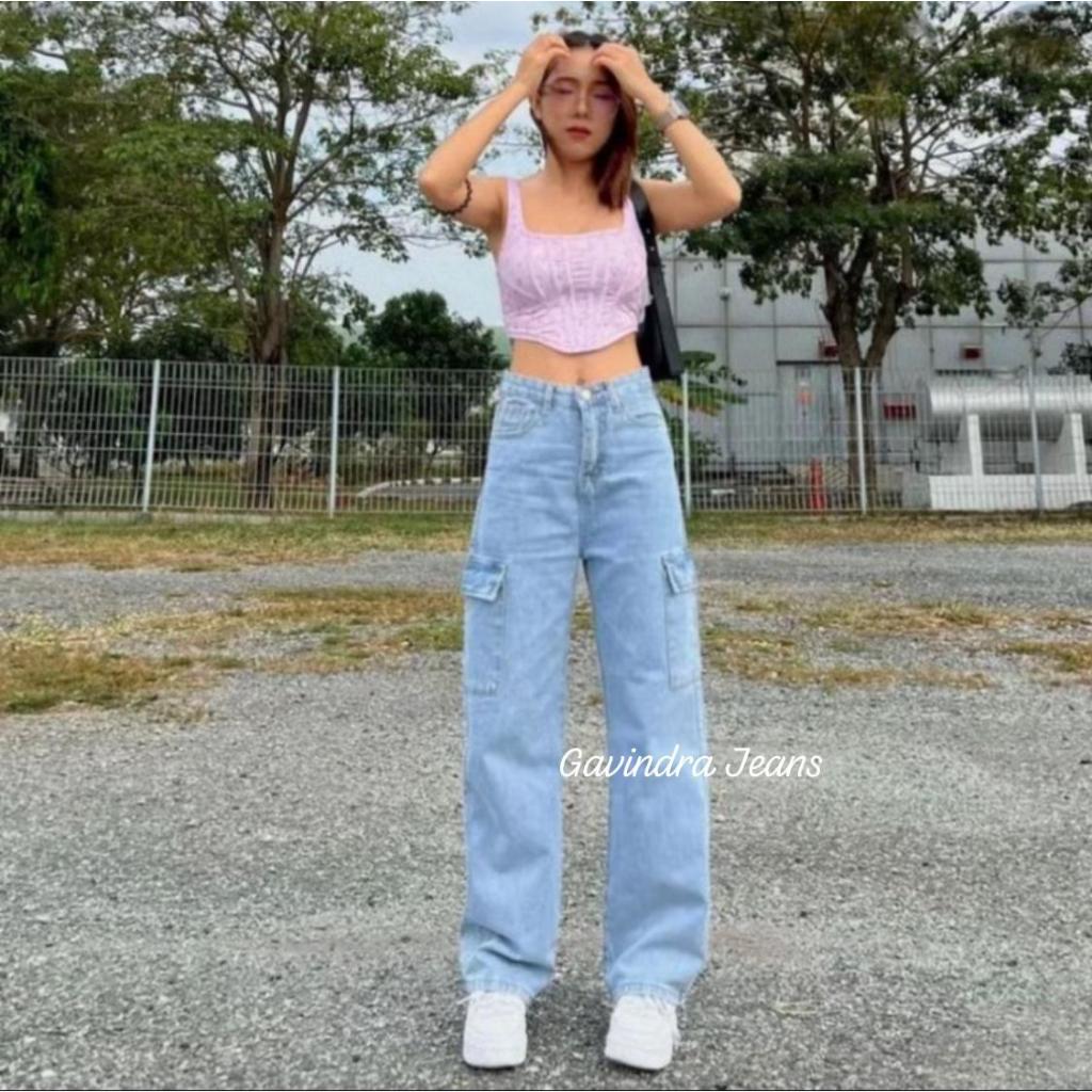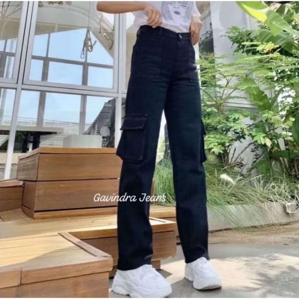The Milasari Store - Celana Jeans Cargo Wanita - Highwaist Cargo Jeans Wanita Kantong Samping Kekinian