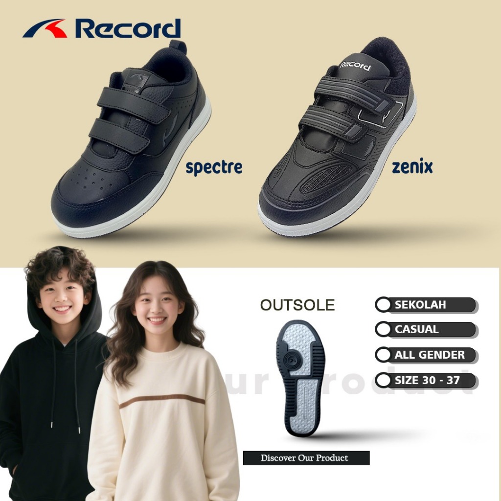 RECORD ZENIX BTS SEPATU SEKOLAH ANAK TK SD SMP COWO CEWE FULL BLACK HITAM PUTIH PEREKAT 30-37 4-13TH