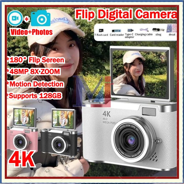 Dengan Kartu 64Gbkamera Digital 4K 48Mp Hd Kamera Digital Dengan Flash Mini Kamera Kamera Swafoto Layar Lipat 180°