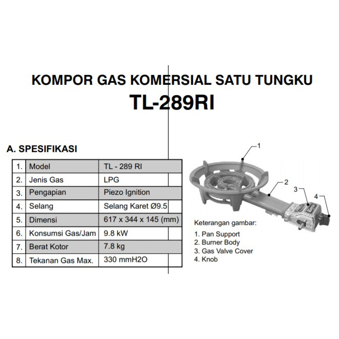 Rinnai TL 289 RI Kompor Gas Komersial 1 Tungku TL-289 RI / TL289 RI / TL 289RI / TL289RI / TL-289RI - Hitam
