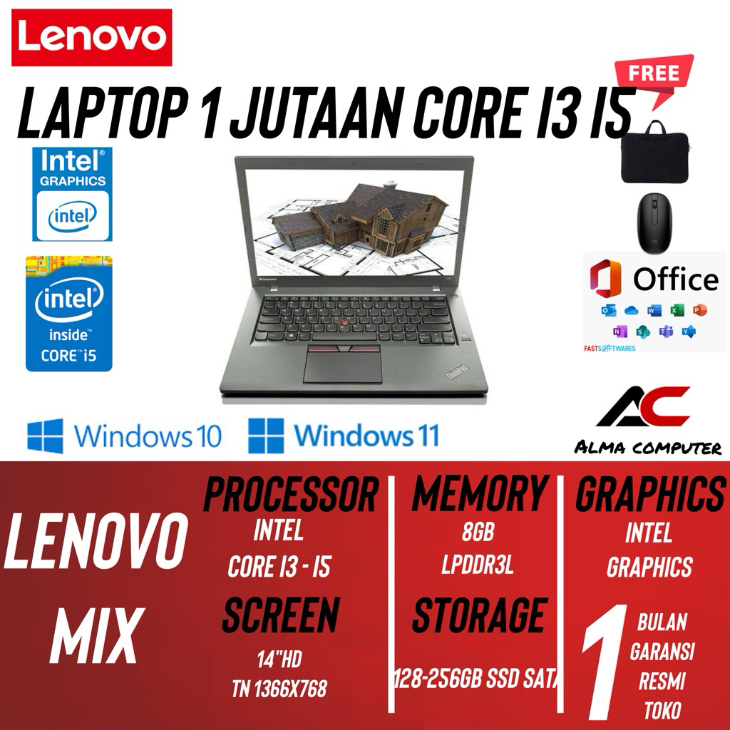 LAPTOP 1 JUTAAN LENOVO CORE I5 I3 RAM 8GB SSD 128GB UPGRADE GAMING KERJA EDITING WINDOWS 10