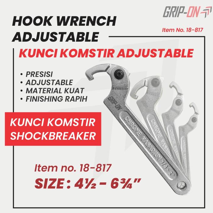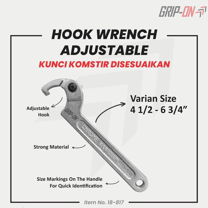 Grip-On Hook Wrench Adjustable Kunci Komstir Flexible 4 1/2 - 6 3/4 In