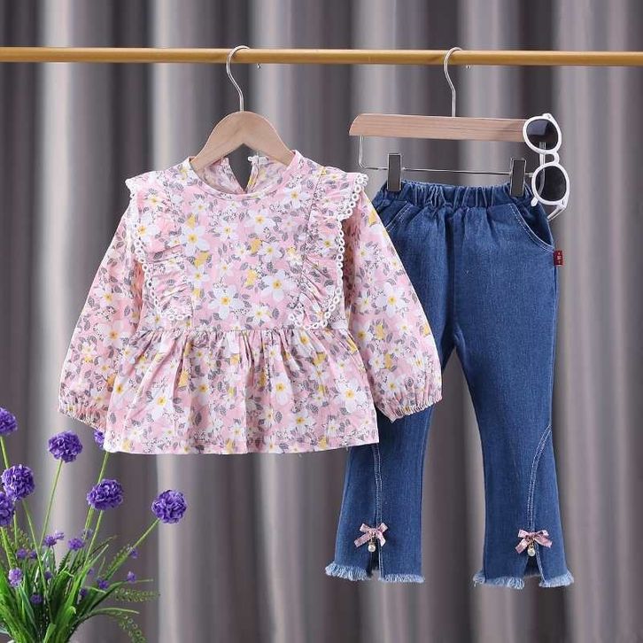 Setelan Baju Anak Perempuan Lengan Panjang Katun Jeans Motif Bunga Casual Style Usia 1-4 Tahun