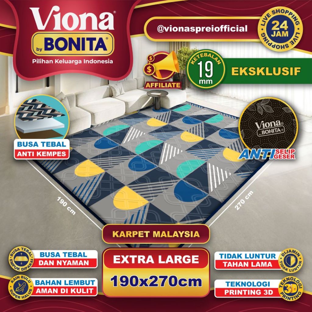 VIONA BONITA 190x270 Karpet Busa Malaysia 19mm eksklusif Motif minimalis - Karpet Lembut & Anti Licin (AF)