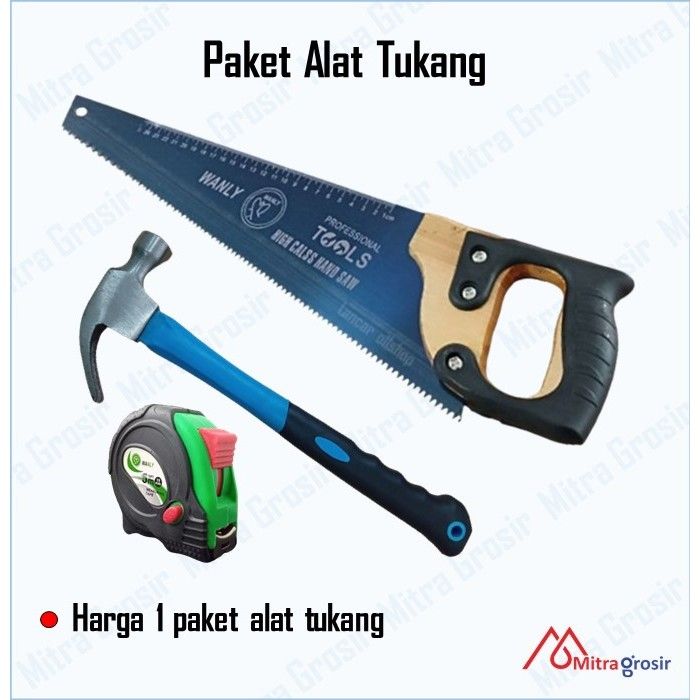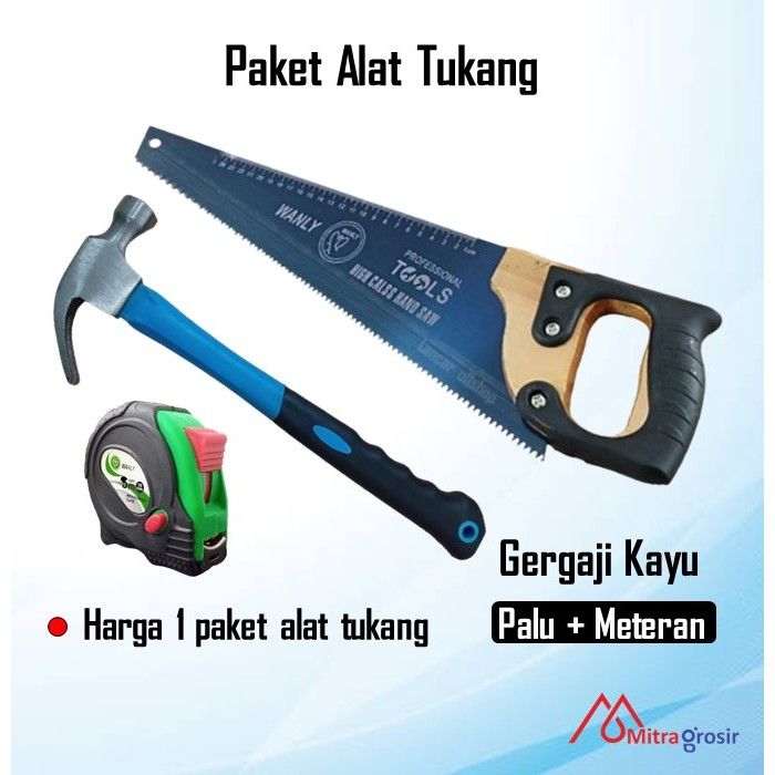 Paket Gergaji Kayu Gagang Karet 18 inch / Gergaji Tukang Graji Murah Meteran Karet Palu Kambing 8 Oz