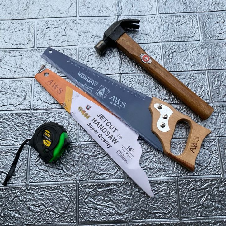 Paket Pertukangan 3 Pcs Gergaji AWS 14 In Meteran 5 M dan Palu Gagang Kayu