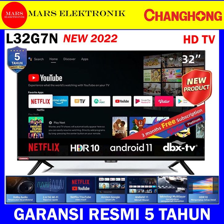PROMO CHANGHONG SMART TV LED L32G7N - NEW 2022 ANDROID 11 - FRAMELESS SMART TV / HD GARANSI RESMI 5 TAHUN ORIGINAL
