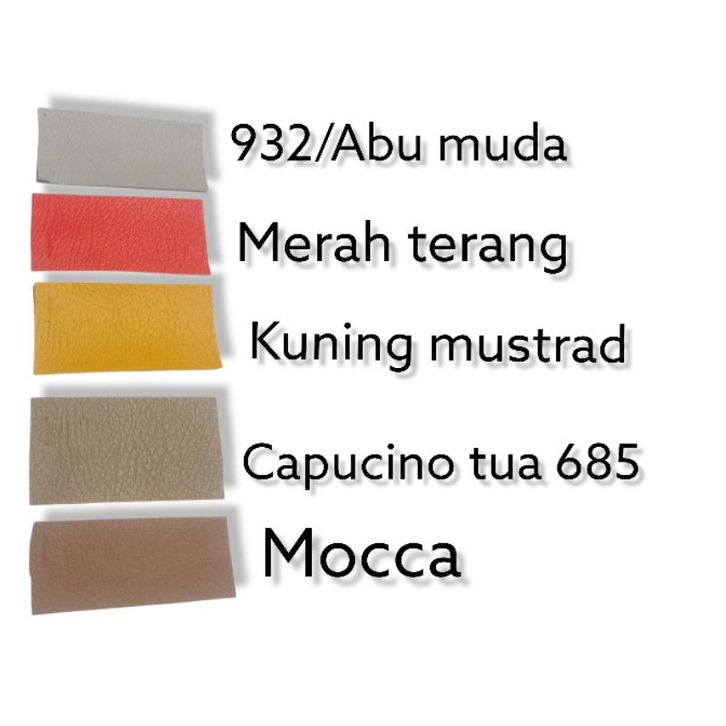 Abu muda, Abu muda/932, Abu tua, Bata, Biru benhur, Biru muda, Capucinno tua 685, Coklat tanah 266, Coklat tua, Cream muda, Fanta, Hijau apel, Hijau armi, Hitam, Kentang, Kuning terang, Maroon, Merah terang, Mocca, Navy, Orange, Pink muda, Toska, Unggu tua, merah danhil, putih
