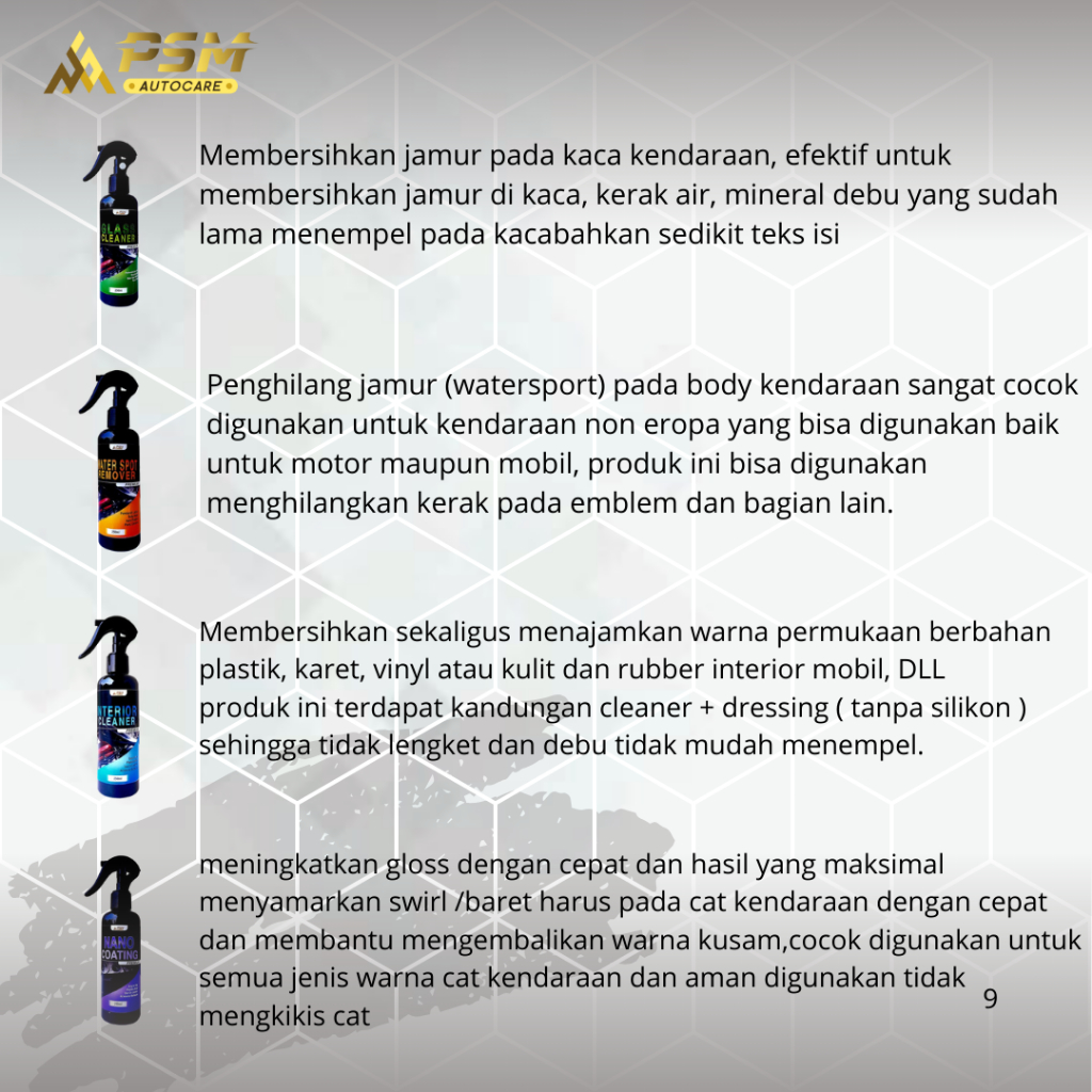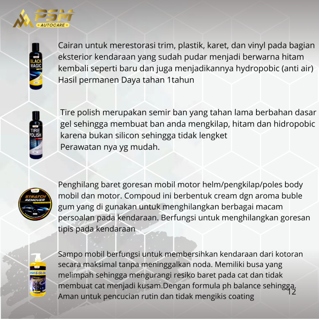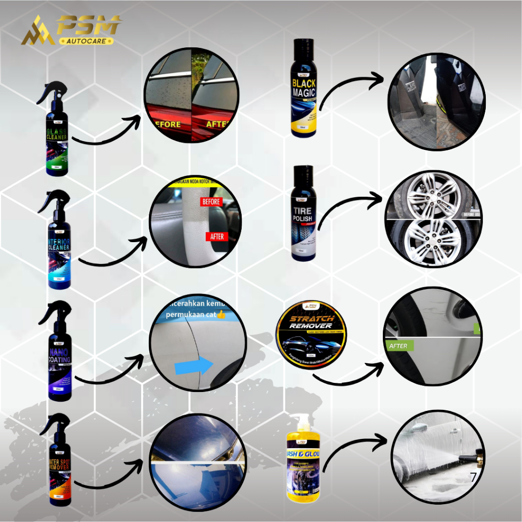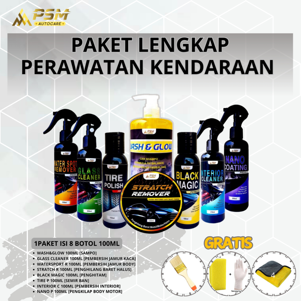 PSM Paket Lengkap Perawatan Kendaraan Kemasan 100ml, Black Magic, Tire Polish, Watersport Remover, Glass Cleaner, Interi