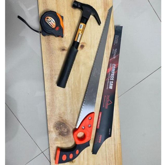 Paket Tukang - Gergaji Kayu Baja Asli Siap Pakai - Palu Kambing 12oz Magnet - Meteran Viper 3 Meter