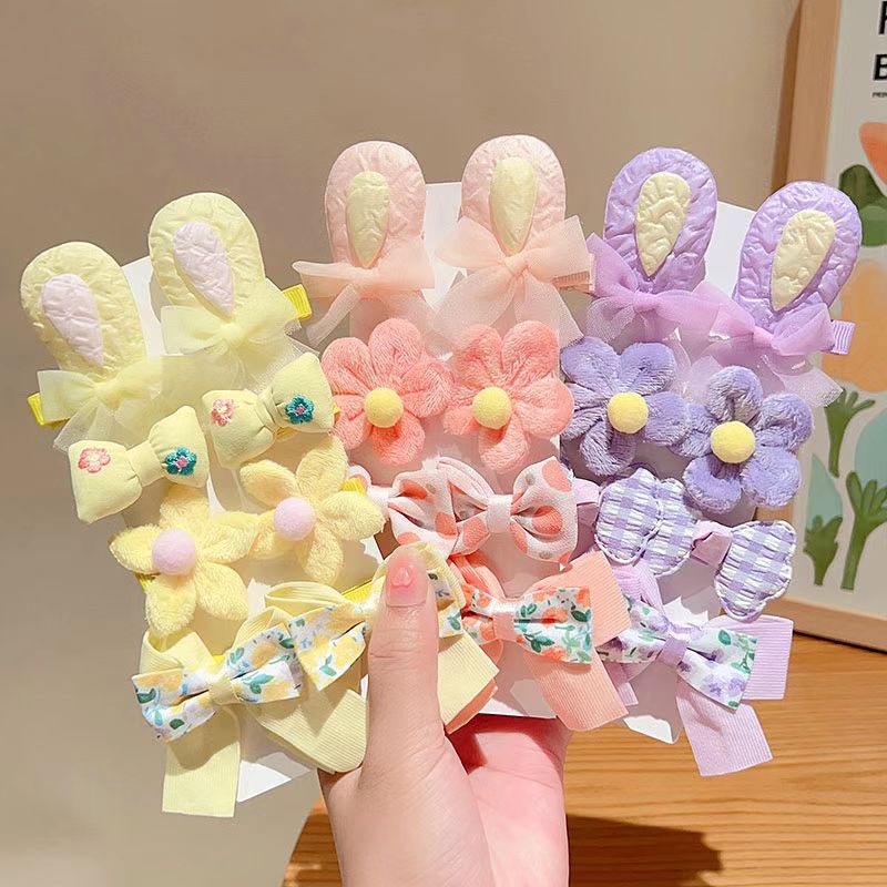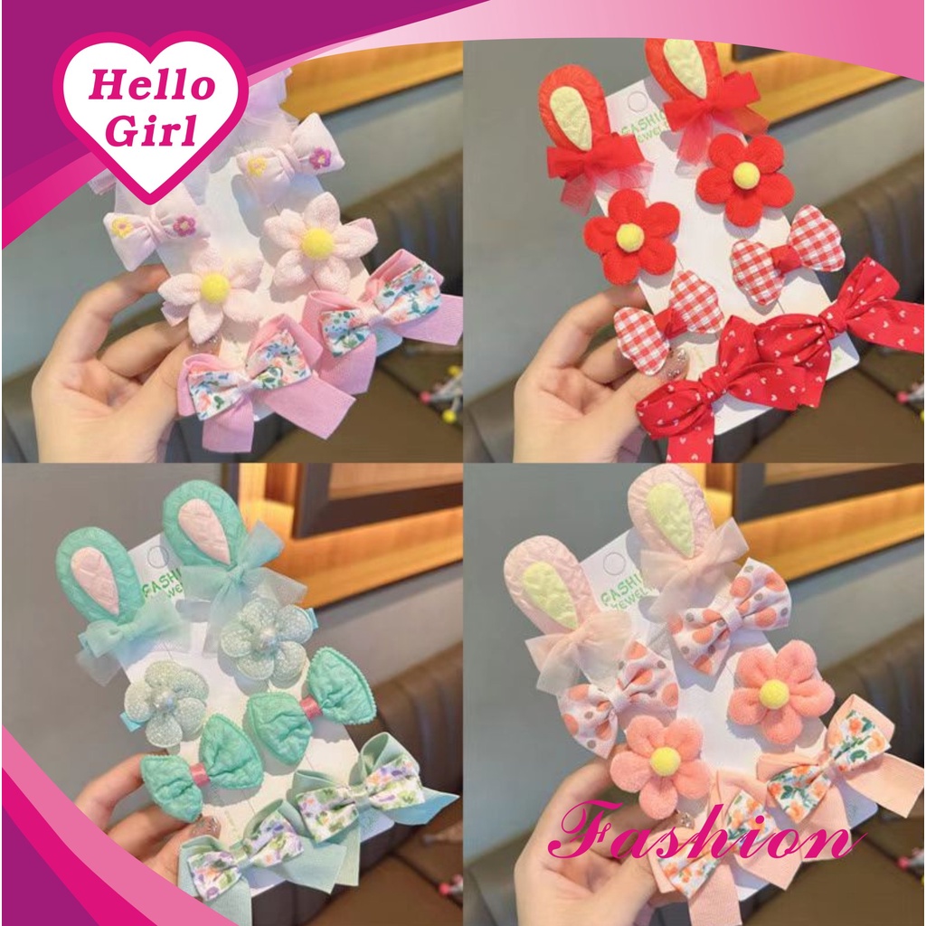 (Hello Girl)F169 Set Jepit Rambut 1Set 8pcs Jepit Anak Motif Telinga Pita Bunga Import