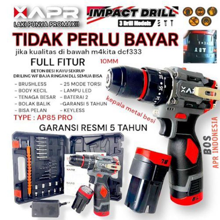 Apr Raja Bor Impact Drill Brushless Type Ap85 Proz 10mm Keyless Auto Lock 2baterai Mesin Bor