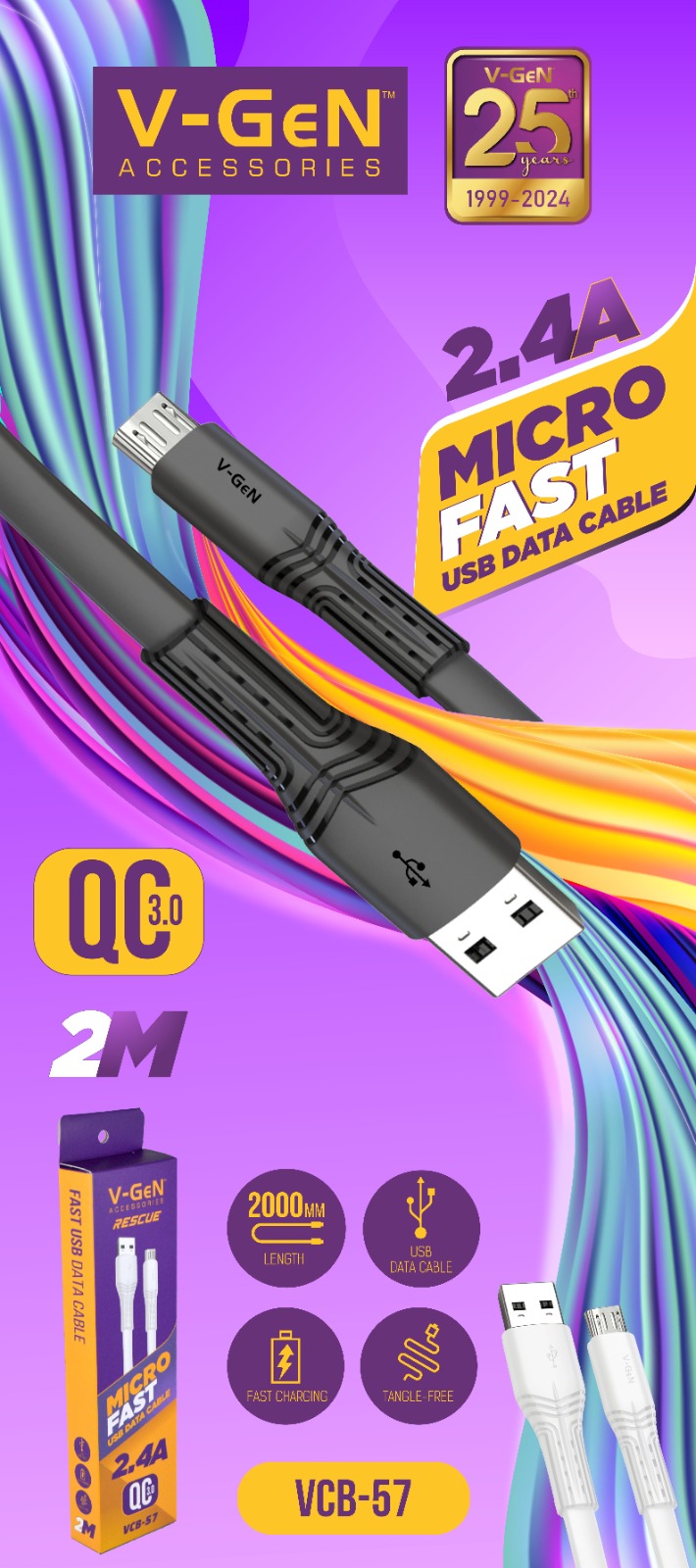 Kabel Data MicroUSB V-GeN VCB-57 Fast Charging 2.4A Micro USB Kabel Pipih 2 Meter