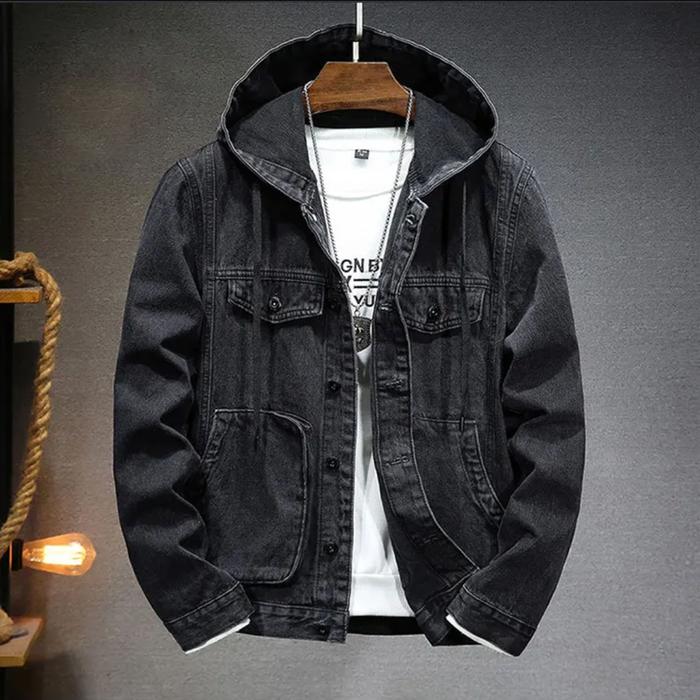 JAKET JEANS DENIM TOPI KUPLUK KANCING HITAM BIRU CASUAL PRIA WANITA PANJANG COWOK DISTRO TEBAL KEREN - HITAM, M