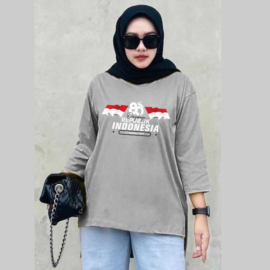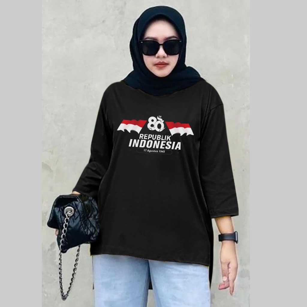 Kaos Oversize Lengan 7/8 Wanita Gambar HUT RI 80th 2025 Dirgahayu Indonesia Bisa Seragaman