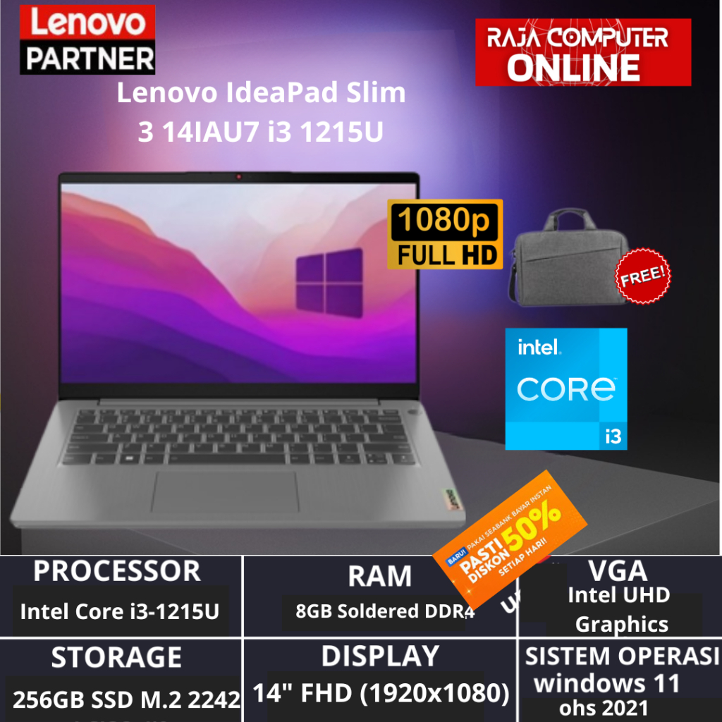 laptop Lenovo IdeaPad Slim 3 14IAU7 i3 1215U 8/16GB SSD 512GB 14" FHD W11+OHS resmi
