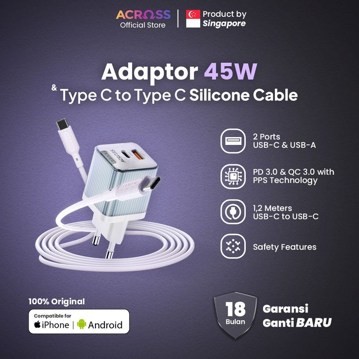 Charger HP Type C / Micro / Lightning ACROSS Kepala Charger 45W Fast Charging Adaptor Charger IPhone & Android 2 Port