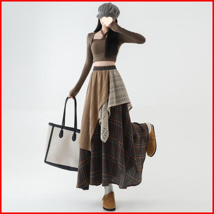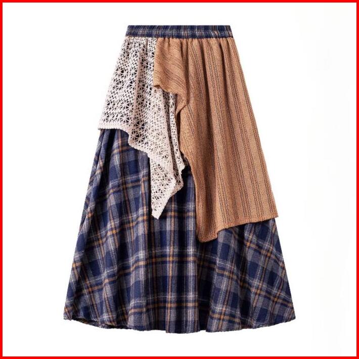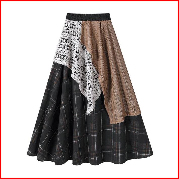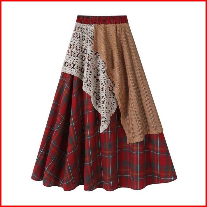 Heysoul Rok Wanita Panjang Bohemian Unik Desain Layered Motif Kotak Tartan Dan Renda Gaya Streetwear Etnik Bawahan Dewas