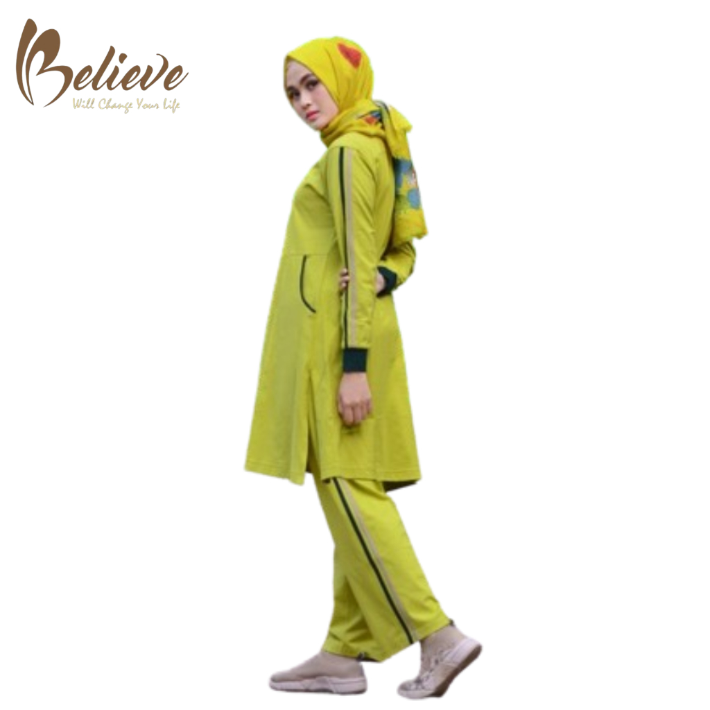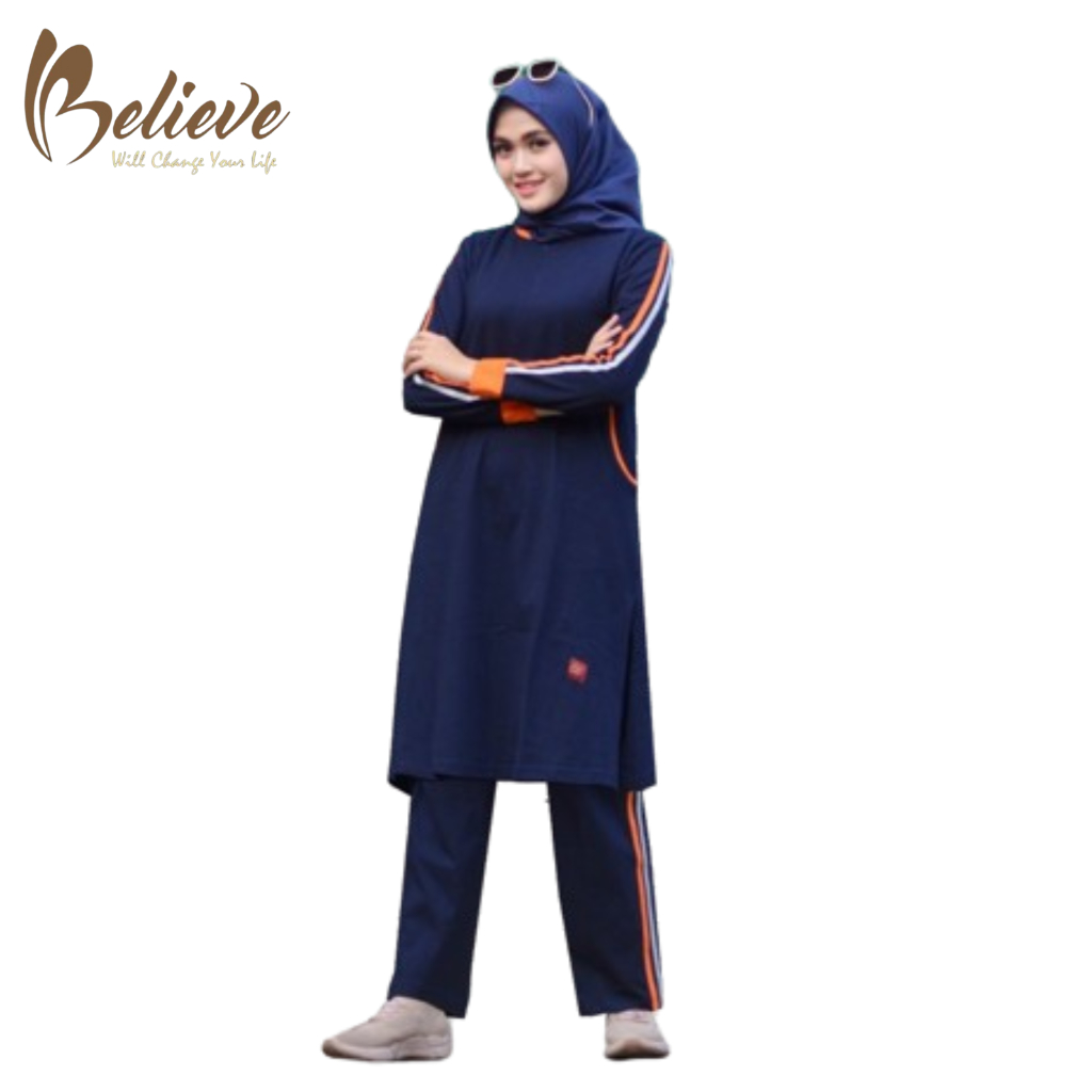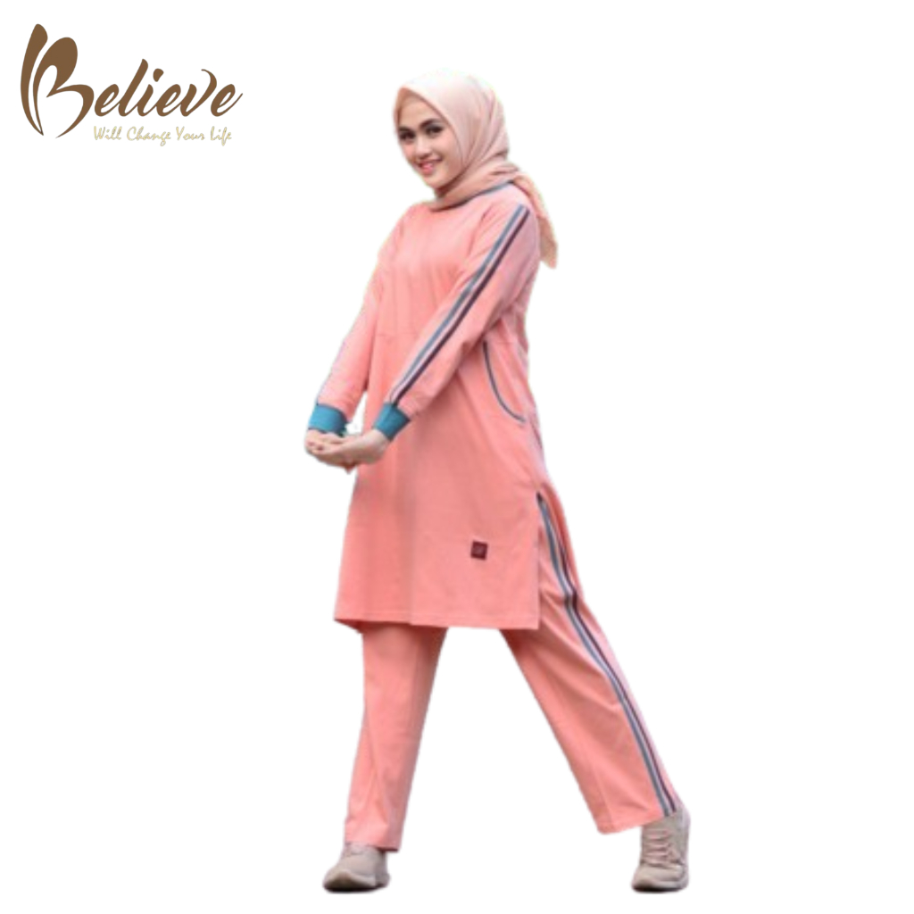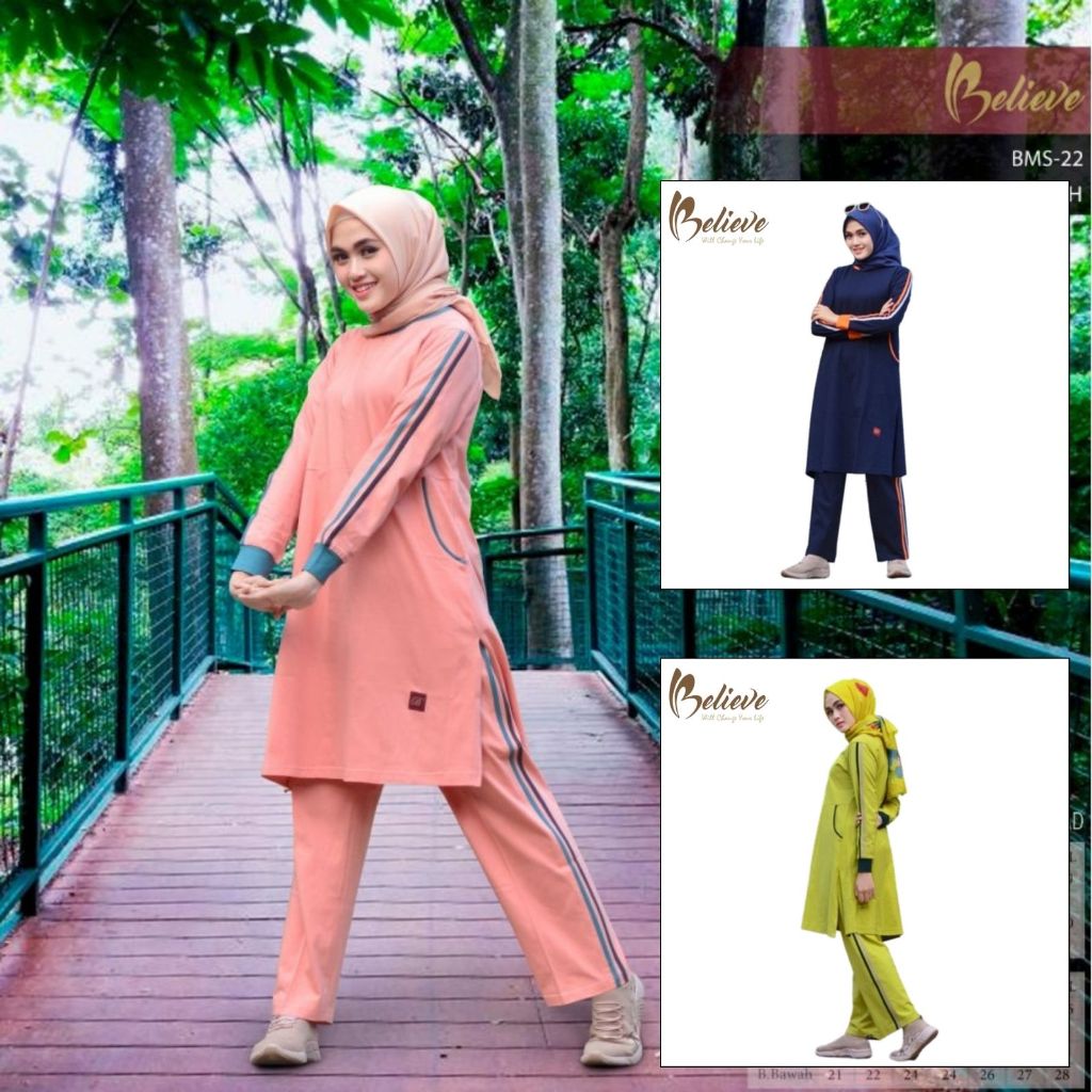 Setelan Baju Olahraga Wanita Muslim Muslimah Believe BMS 22 Kaos Katun Combed Senam Jogging Terlaris
