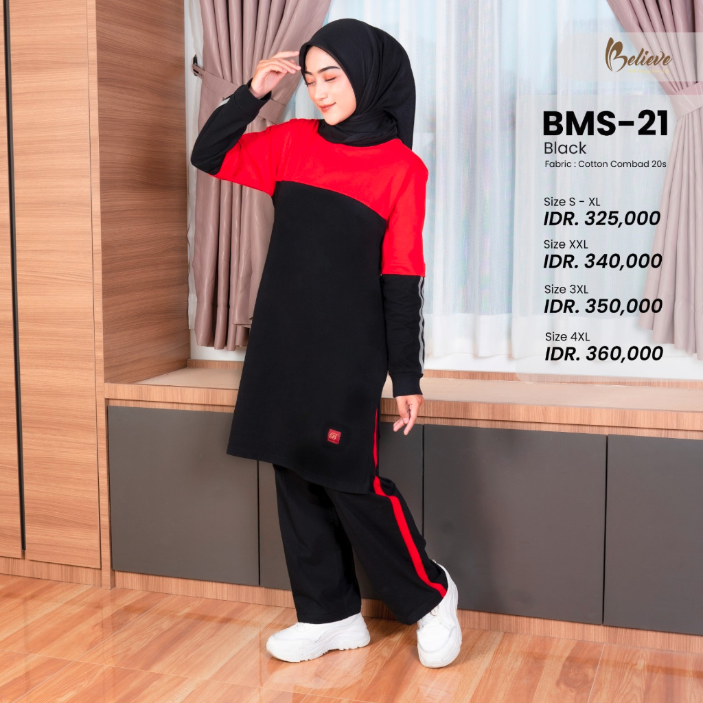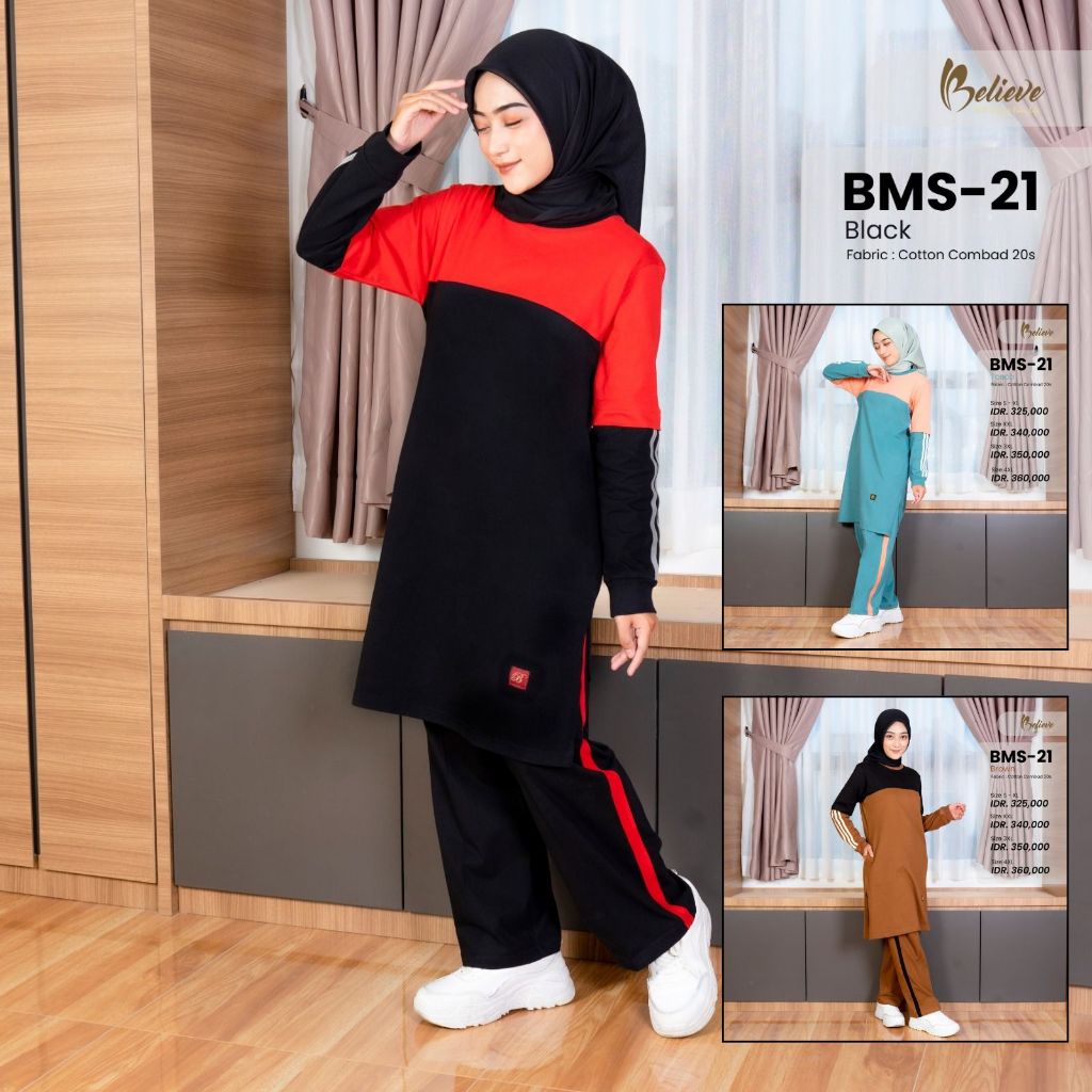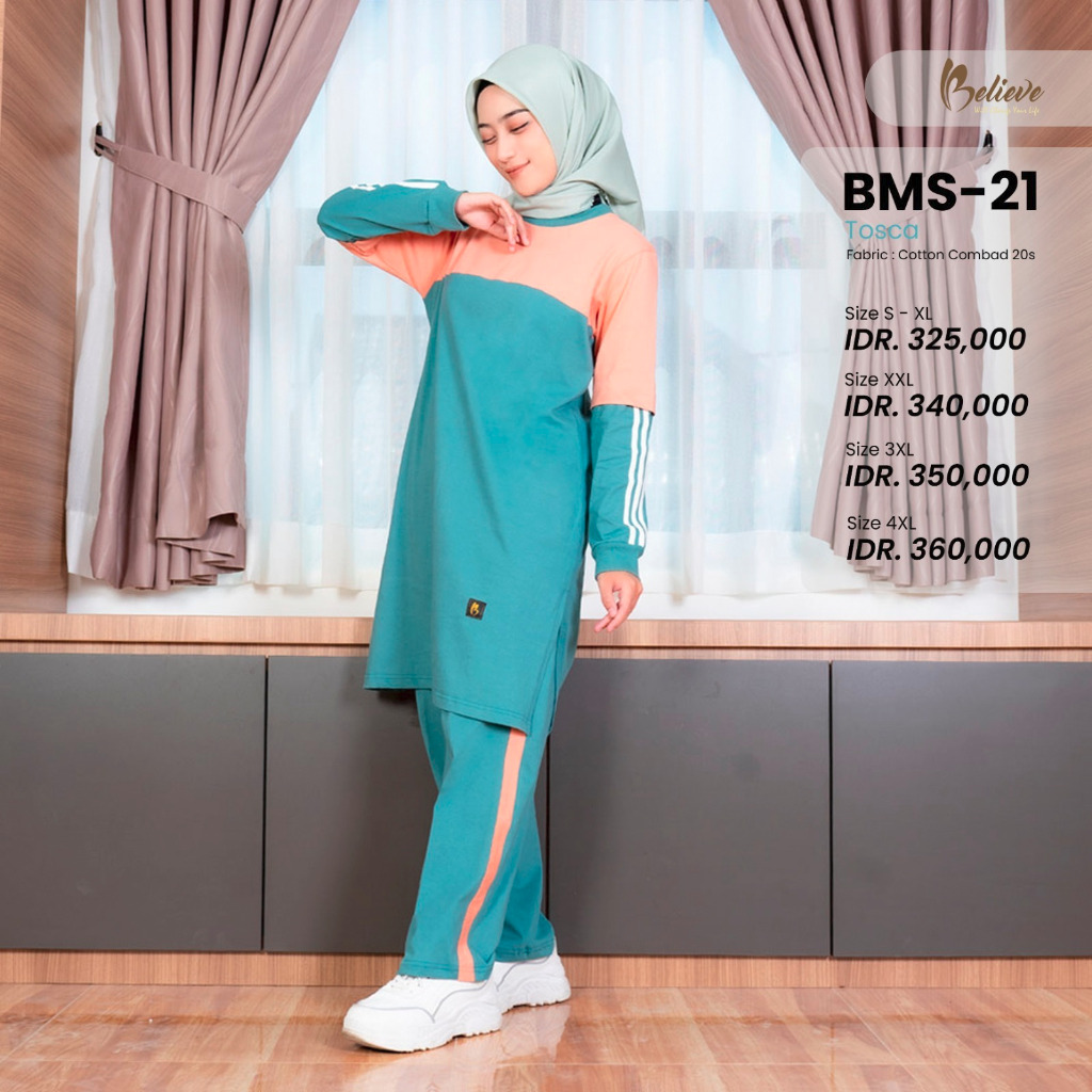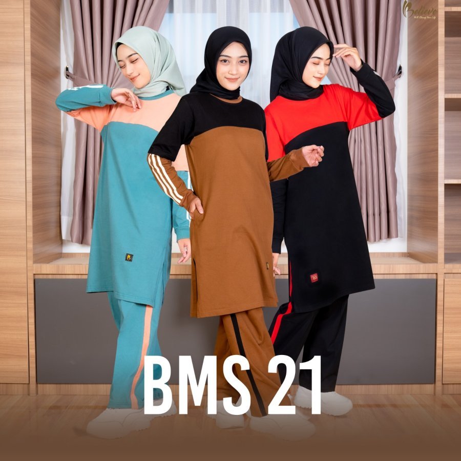Diskon Terlaris Setelan Baju Olahraga Wanita Muslim Muslimah Kaos Believe BMS 21 Katun Combed Senam