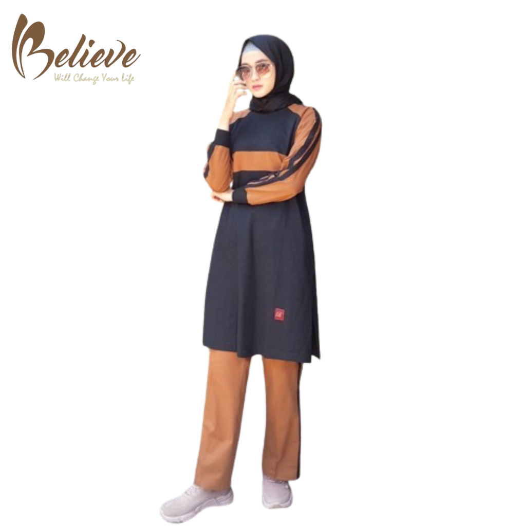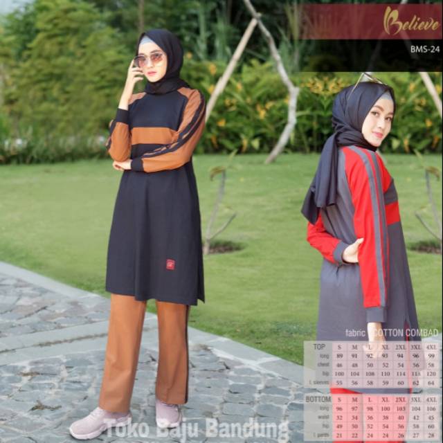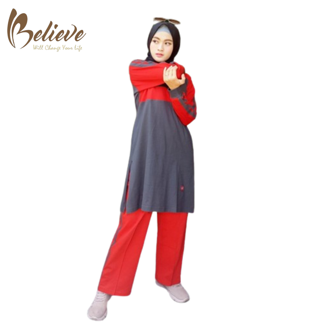 Diskon Setelan Baju Olahraga Wanita Muslim Muslimah Kaos Believe BMS 24 Katun Combed Senam Jogging