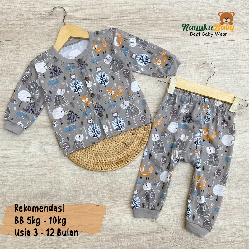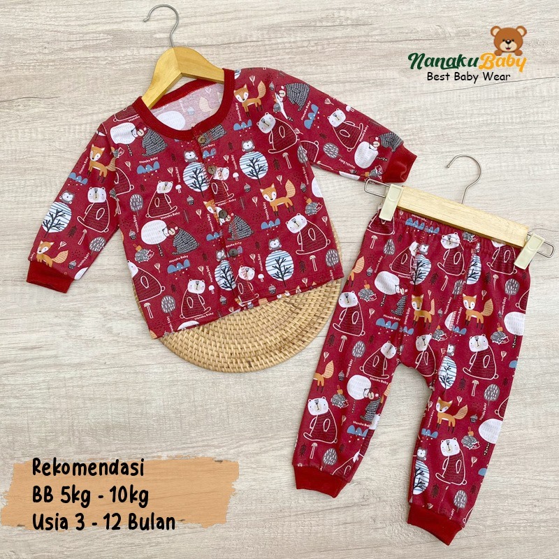 Nanaku Baby (Motif Printing Panda Burhan) Setelan Piyama Bayi Kancing Depan || Setelan Baju Tidur Lengan Panjang || Setelan Baju Bayi Celana Pempers || Set Piyama Printing Usia 3-12 Bulan