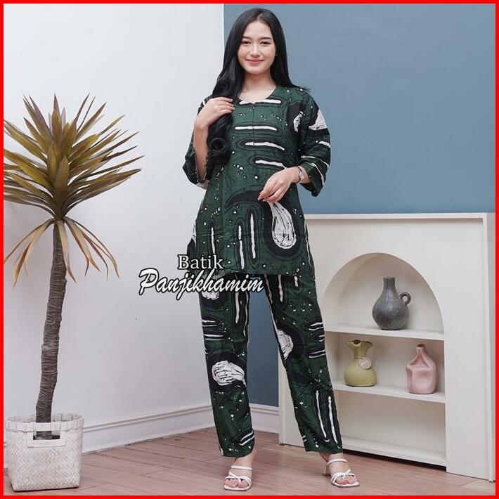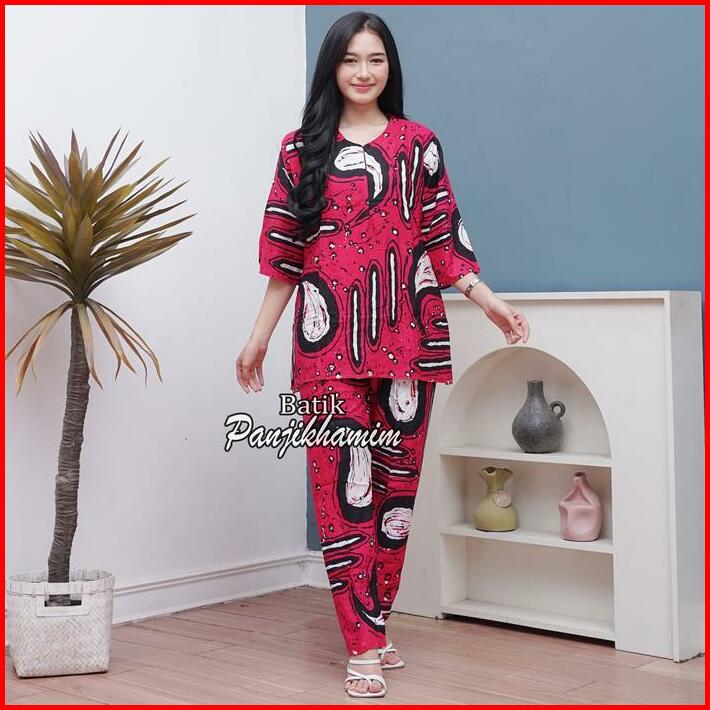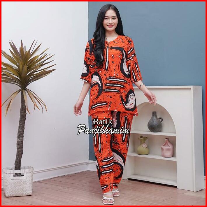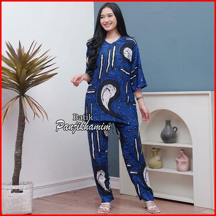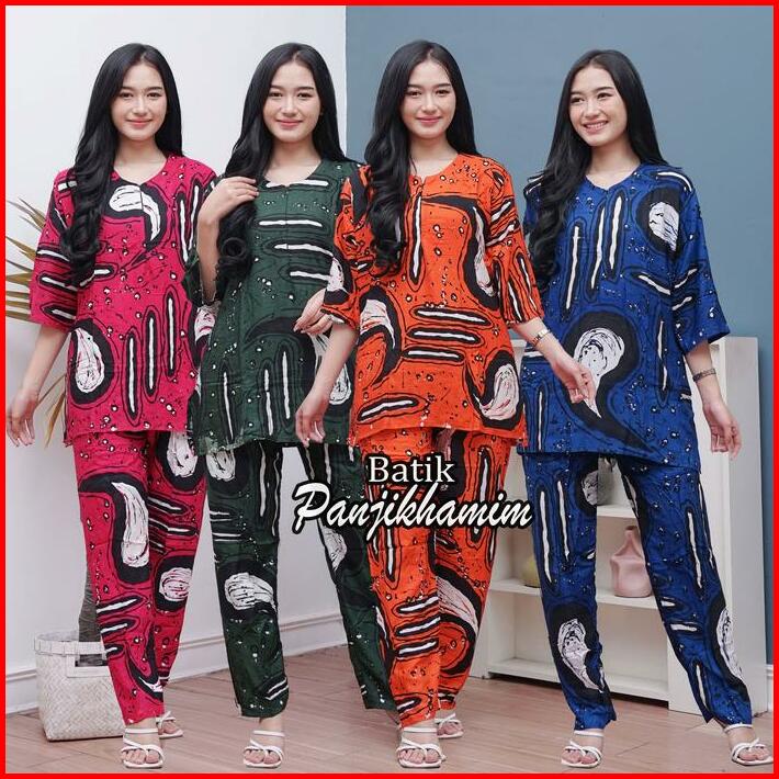 One Set Wanita Rayon Jumbo Lengan 3 4 Busui Setelan Batik Baju Tidur Motif Abstrak Celana Panjang