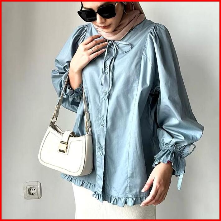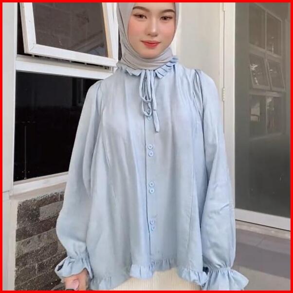 Kf- Anya Kemeja Wanita Rempel Tali Lengan Lonceng Polo Linen