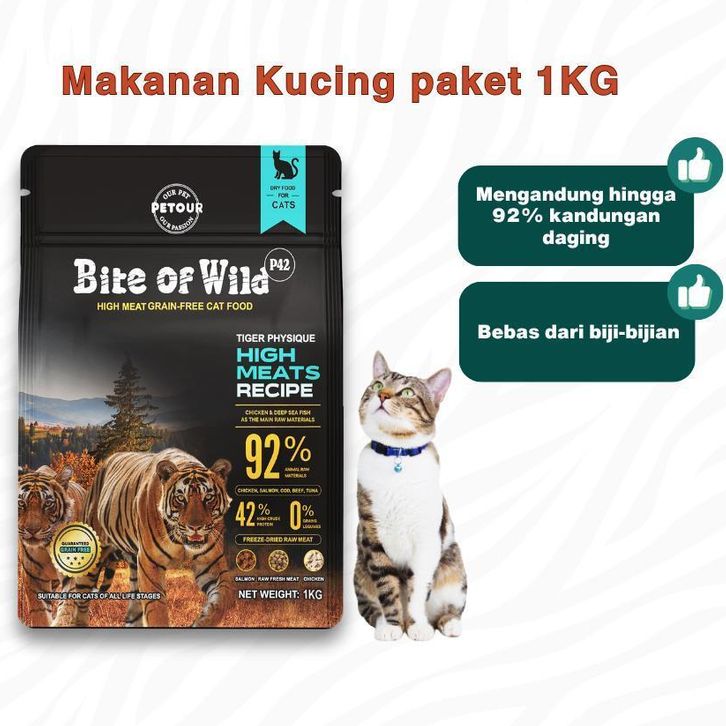 Makanan Kucing Penggemuk Makanan kucing kering Bite Of Wild 1kg bebas biji bijian, dengan toping salmon, ayam dan
