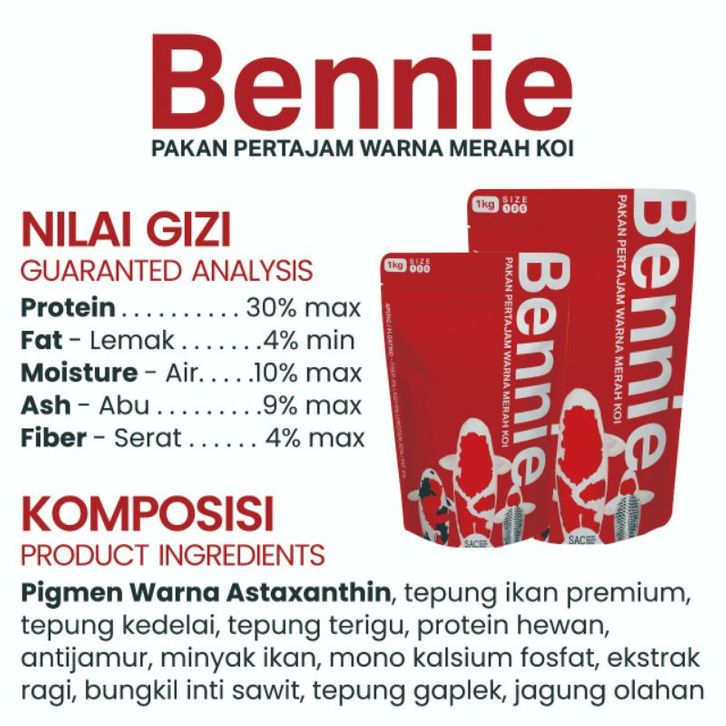 pakan makanan pelet ikan Koi pertajam Warna Merah Bennie 1kg 5mm 2mm Extreme Red Color