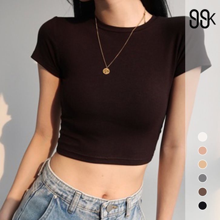 【Premium】99koutlet Atasan Cropped Wanita Short Sleeve Crew Neck Kaos Slim Fit Basic Tshirt Ribbed Polos (S/M/L/XL) 7302