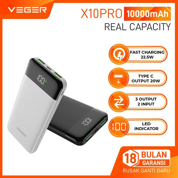 VEGER Powerbank X10 PRO 10000mAh 2 USB LED Digital Display Quick Charge 22.5W PD 20W Power Bank